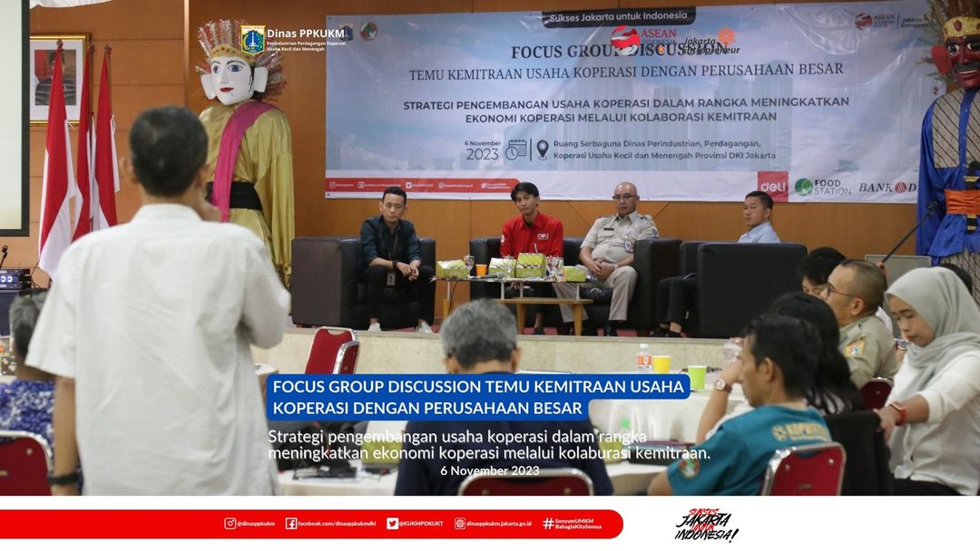 Dinas Perindustrian, Perdagangan, Koperasi, Usaha Kecil dan Menengah Provinsi DKI Jakarta menyelenggarakan Focus Group Discussion (FGD) Kemitraan Usaha Koperasi dengan Perusahaan Besar dengan Tema Strategi Pengembangan Usaha Koperasi Dalam Rangka Meningkatkan Ekonomi Koperasi Melalui Kolaborasi Kemitraan pada hari Senin (6/11).