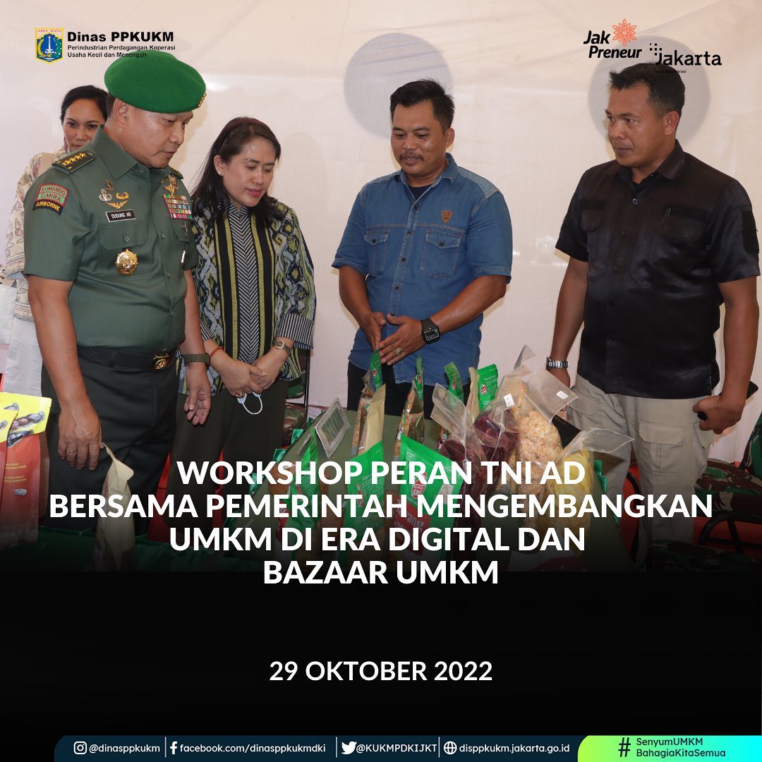 Peserta Workshop ini adalah para pelaku UMKM dari berbagai wilayah di DKI Jakarta. Selain workshop, TNI AD juga menggelar Bazaar UMKM yang menjual berbagai macam produk mulai dari makanan dan minuman, baju hingga kerajinan tangan. Setelah mengikuti dan menyimak kegiatan Workshop, Kepala Staff TNI AD Bapak Dudung Abdurahman Bersama jajarannya diikuti juga oleh Beberapa Kepala Dinas dan Kepala Dinas PPKUKM Provinsi DKI Jakarta Ibu Elisabeth Ratu bersama staf pendampingnya berkeliling ke tenant-tenant Bazaar UMKM tersebut.