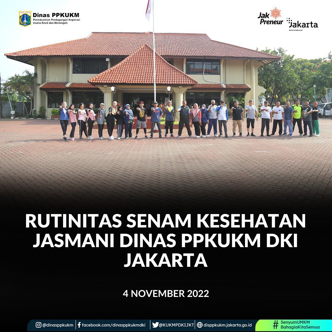 Dinas Perindustrian, Perdagangan, Koperasi, Usaha Kecil dan Menengah Provinsi DKI Jakarta, melakukan kegiatan Senam Kesegaran Jasmani pada 4 November 2022 dari pukul 7.00 - 8.00 WIB di lapangan DInas PPKUKM.