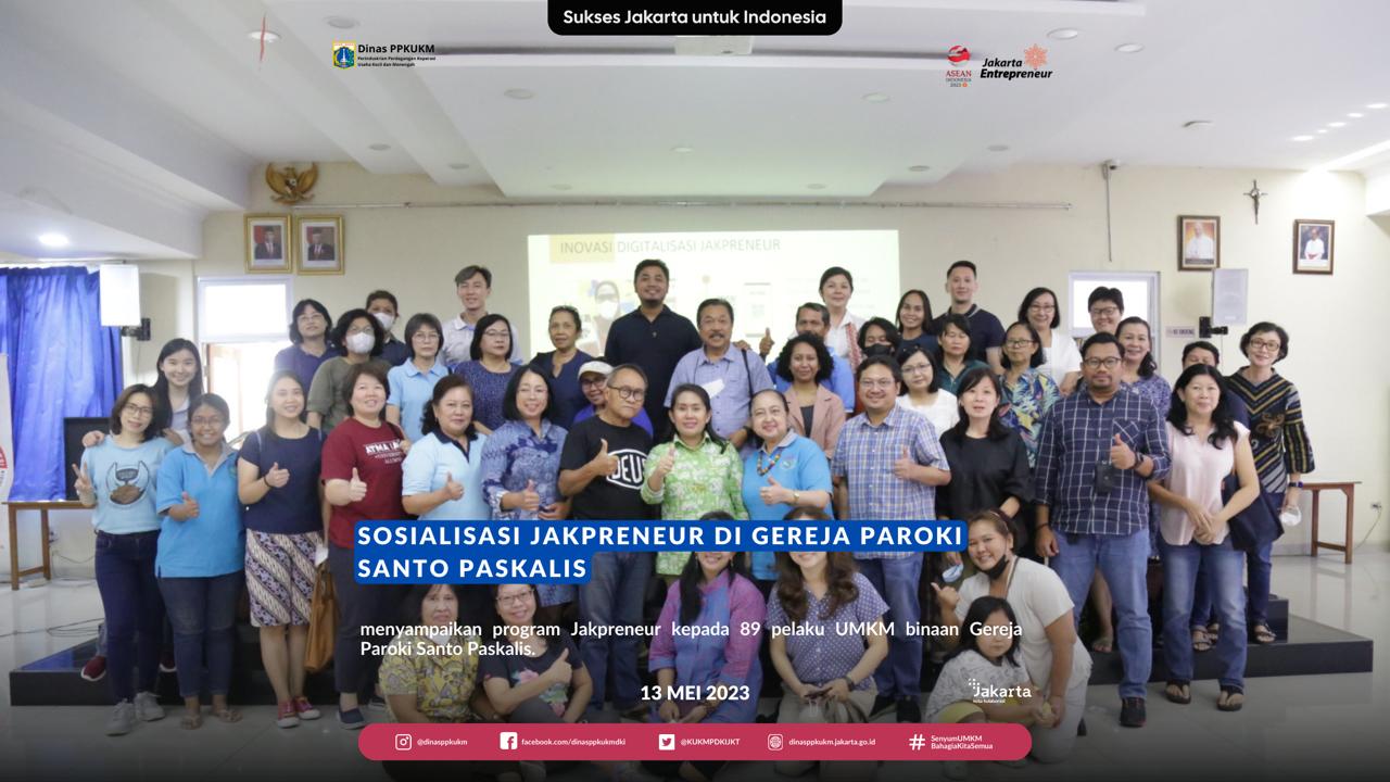 Dinas Perindustrian, Perdagangan, Koperasi dan Usaha Kecil dan Menengah atau PPKUKM Provinsi DKI Jakarta melakukan Sosialisasi Jakpreneur di Gereja Paroki Santo Paskalis, Cempaka Putih pada hari Sabtu (13/05).