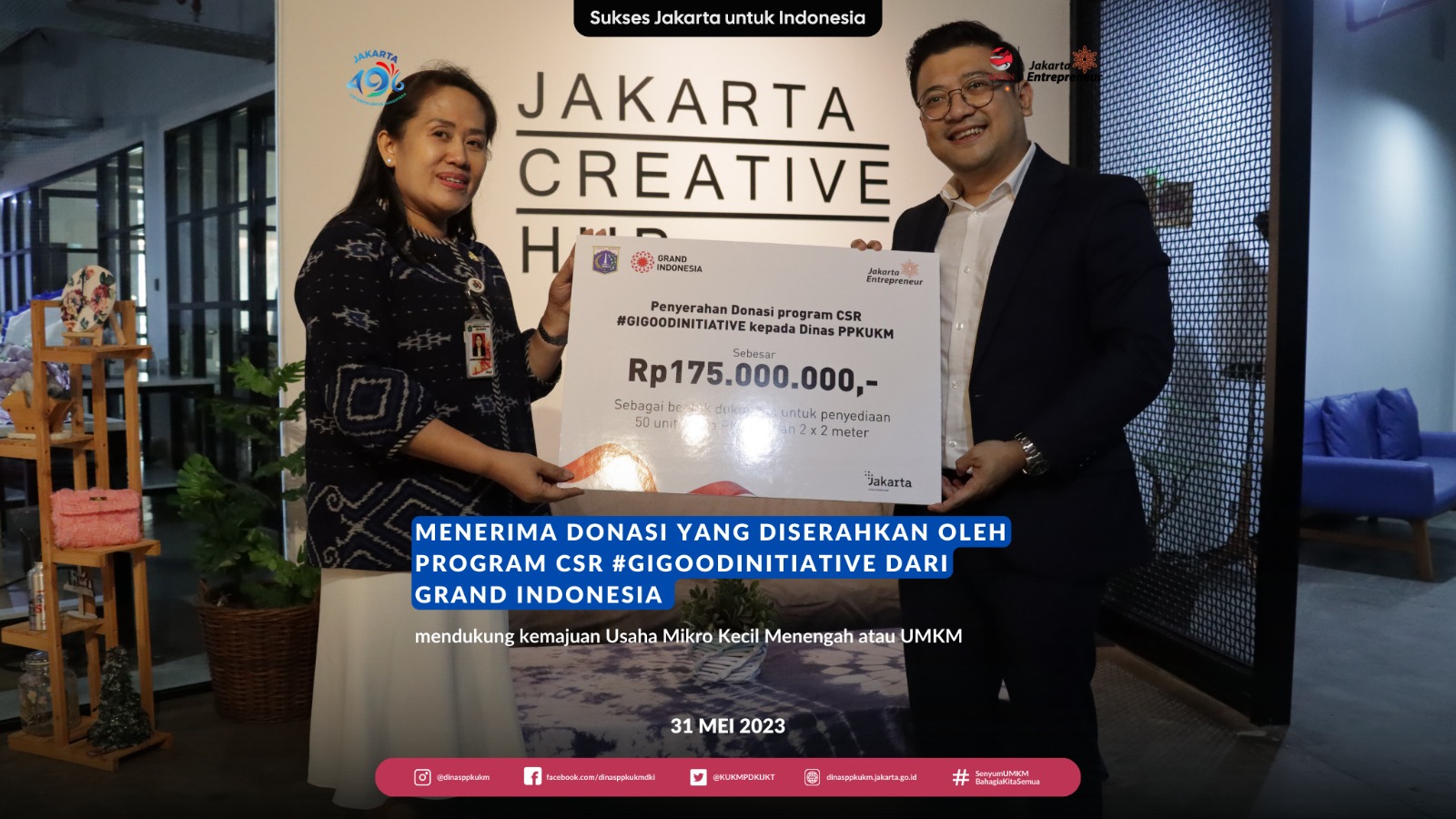 Dinas Perindustrian, Perdagangan, Koperasi, Usaha Kecil dan Menengah atau PPKUKM DKI Jakarta menerima donasi yang diserahkan melalui program CSR #GIGOODINITIATIVE dari Grand Indonesia (31/5).